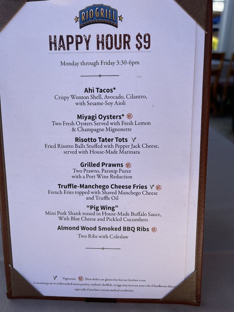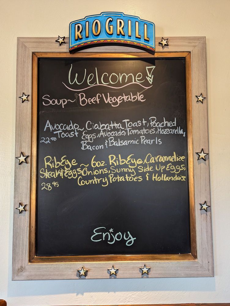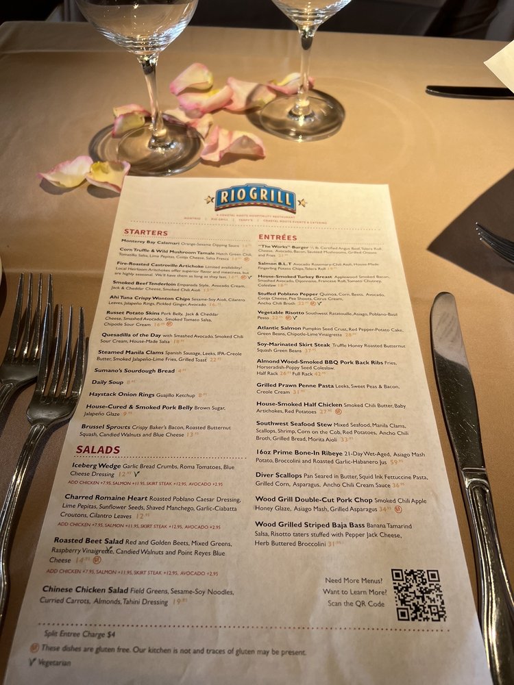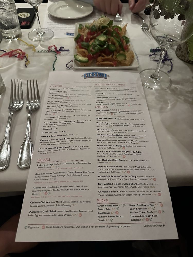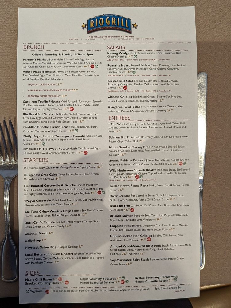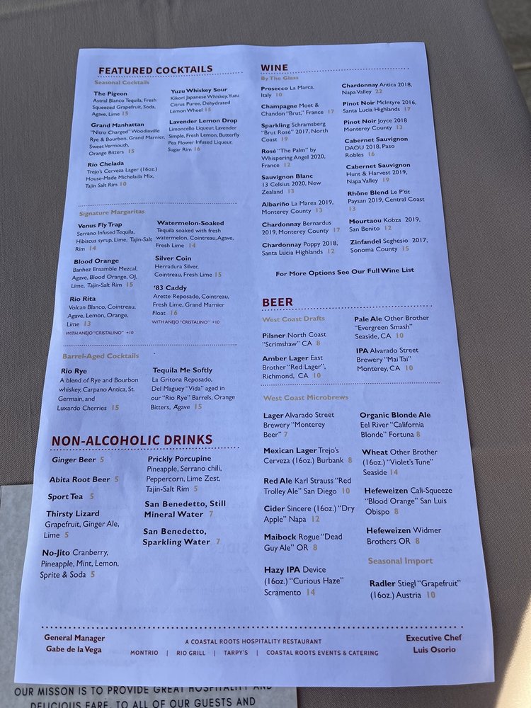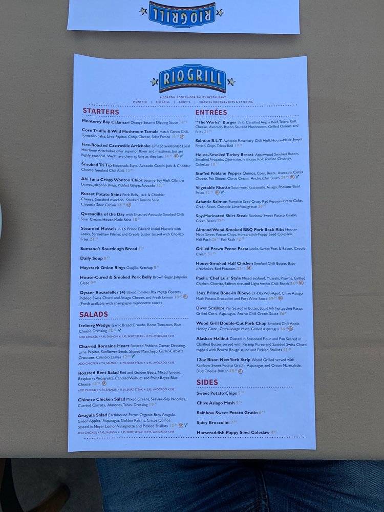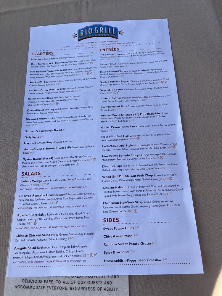 Introducing Rio Grill, a vibrant restaurant located in Carmel, CA offering a diverse menu with Vegan and Vegetarian options. Known for their Smoked TriTip Sweet Potato Hash and House Made Benedict, Rio Grill also serves creative starters like Monterey Bay Calamari and Fire-Roasted Castroville Artichoke. Their salads such as Chinese Chicken Salad and Roasted Beet Salad are customer favorites. The atmosphere is described as big, bright, and rustic, making it a hidden gem worth visiting. Reviews rave about the friendly service, delicious food, and great ambiance. Customers highlight the generous portion sizes and well-balanced flavors of their dishes. With a full bar, outdoor seating, and gender-neutral restrooms, Rio Grill caters to all preferences. Don't miss out on this culinary experience in Carmel.